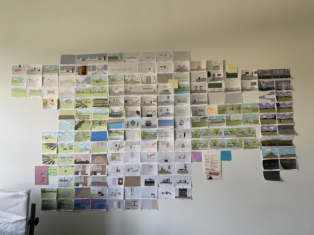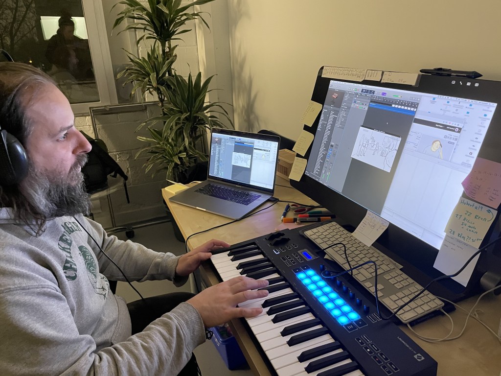 As a self-taught artist, when I make animation films, I always make sure I have someone by my side who’s way better at technique than me. All my films that received fundings were made with my friend Nicolas Moussette, who is both the animation director and technical director. As I’m not good at technical drawings, on When Adam Changes I didn’t take care of the backgrounds. In my short films, they’re always very minimalist. For a feature film, I wanted more realistic backgrounds to help keep the spectator involved. So I asked two visual artists I like a lot, Isabelle Guimond and Carolyne Scenna (Carolyne also drew most of the accessories). For the soundtrack, I worked with musicians I love, first Mathieu Charbonneau with whom I worked on the score, then Maxime Veilleux and Simon Trottier with whom we created all the tracks heard by the characters. We didn’t have enough money to buy existing songs, so we composed and recorded an album in which we picked extracts, it was very satisfying and fun.